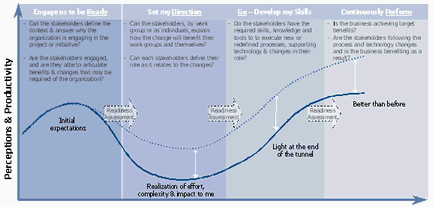 d upon what the benefit of the transformation will be for the organization as a whole. Once they begin to receive more detail, they begin to ask how the initiative will impact their work group and them; and they begin to ask “What about me?” This is a crucial stage. If their questions are not appropriately answered, their perceptions and, in turn, their productivity will begin to spiral downward. The lack of information will cause them to fill in the blanks for themselves with information that may or may not be factual, thus creating barriers to the implementation that could be costly to overcome. If their questions are addressed effectively and they see how they will eventually fit into the solution, the risk is managed and their perceptions and in turn their productivity begins to increase.