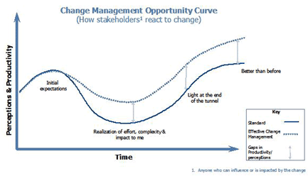 A successfully executed change program should prevent a dip in employee perception/productivity as indicated by the dashed line in the Change Management Opportunity Curve below:
